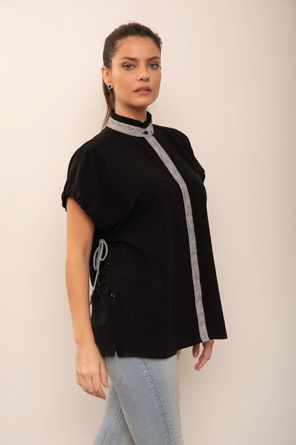 Modelagem ampla inspirada em quimonos tradicionais. Cordões laterais ajustáveis com ponteiras de borracha. Vista dupla em tecido cinza e acabamento à fio.