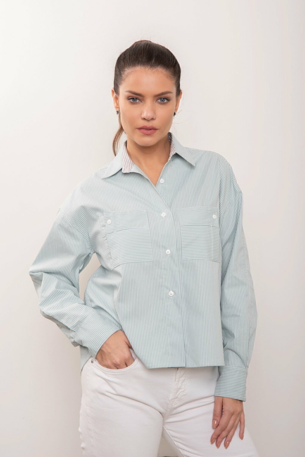 Modelagem ampla e curta. Bolsos frontais com botões formando uma leve prega. Pala dupla com prega macho. A modelagem é reta e encurtada, com caimento leve e confortável - ideal para composições frescas e descomplicadas. A gola tradicional ganha um toque diferenciado com acabamento cinza interno, revelando sofisticação nos detalhes. Fechamento frontal com botões de resina.