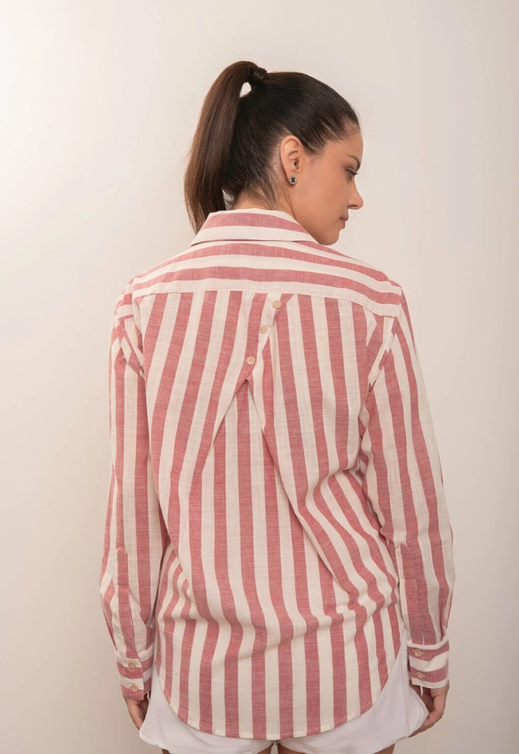 Modelagem ampla com bolso frontal e vista embutida. Botões de madeira natural. Pregas nas costas com abotoamento invisível. Peça leve, fluida e extremamente confortável.
